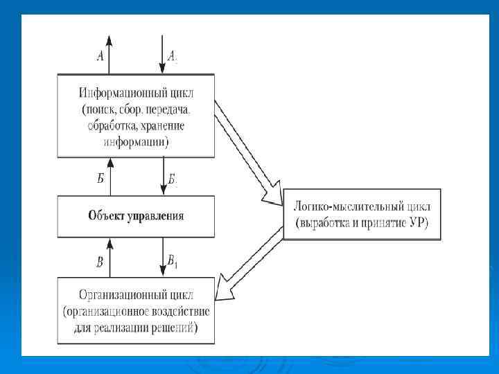 Технология в процессе управления Ø Ø Ø включает три основных цикла: 1) информационный (поиск, сбор, передача, обработка, хранение информации); 2) логико-мыслительный (выработка и принятие управленческого решения); 3) организационный (организация исполнения управленческого