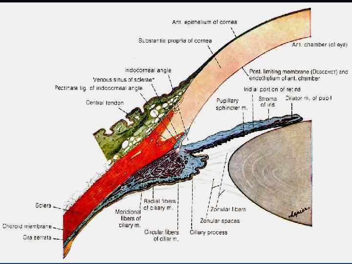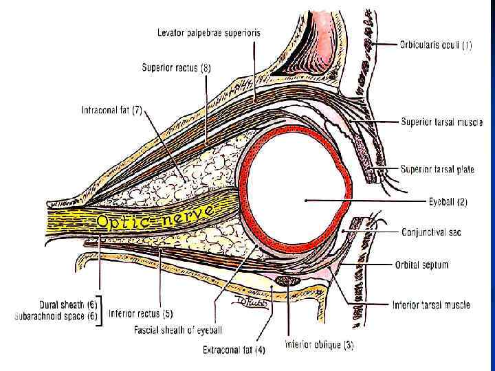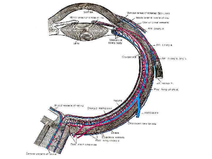 1. 2. 3. 4. 5. 6. 7. Цилиарное тело Задняя камера Радужка Хрусталик Роговица Склера Верхняя прямая мышца 8. Хориоидея 9. Сетчатка 10. Стекловидное тело 11. Зрительный нерв Глазное яблоко. Сагиттальный разрез