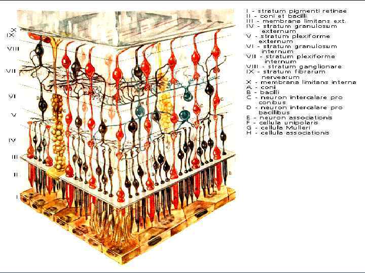 Внутренняя оболочка глазного яблока , сетчатка, образована волокнами зрительного нерва и тремя слоями светочувствительных клеток. Ее воспринимающие элементы — световые рецепторы: палочковидные и колбочковидные клетки ( «палочки» и «колбочки» ). n Сетчатка глаза, в отличие от других периферических рецепторов, представляет собой сложнейшее нервное образование, рассматриваемое некоторыми авторами как кусочек коры головного мозга, вынесенный наружу. n