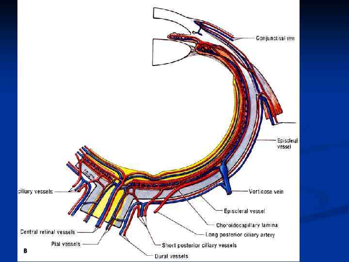 Оставшаяся часть волокнистого слоя глаза – это плотное, прочное, непроницаемое покрытие, белочная оболочка глаза. Внешний слой яблока содержит кровеносные сосуды, которые образуют «налитый кровью глаз» , когда он раздражен. Средний слой глазного яблока является густо пигментированным, хорошо оснащенным кровью, и включает основные сложные структуры. Наиболее глубокий слой включает сетчатку глаза. В середине глаз состоит из передней полости, наполненной водянистой жидкостью. Задняя полость наполнена гелеобразной стекловидной жидкостью. Внутреннее давление (внутриглазное давление), которое производится жидкостью внутри глаза, поддерживает форму передней полости, в то время как жидкость с удерживающей тканью поддерживает форму задней полости глаза. n