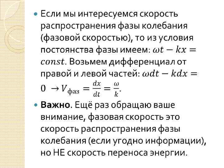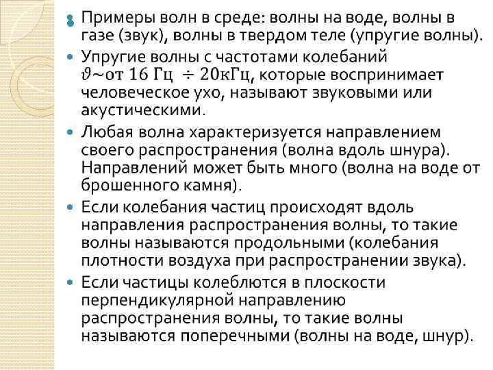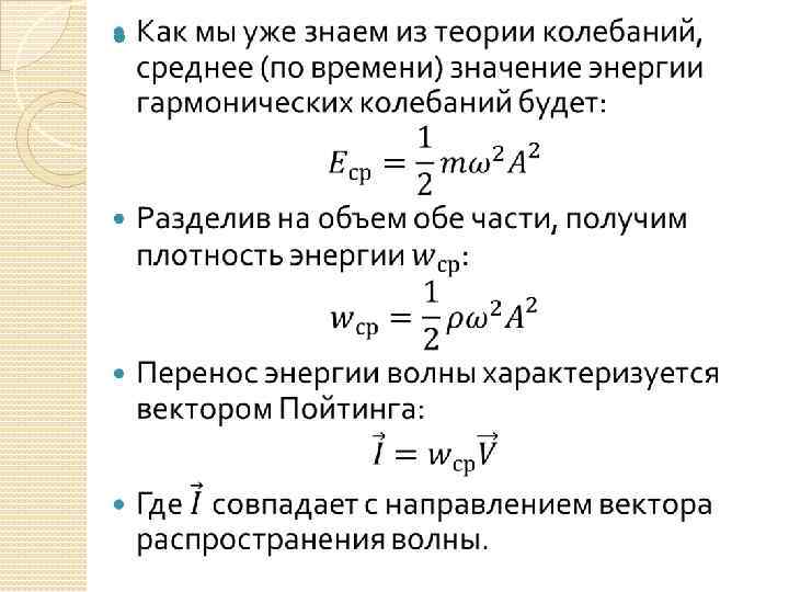 Важно! Волна не несет с собой никаких материальных частиц (они не смещаются, а лишь колеблются около положения своего равновесия). Переносится лишь само возмущение, приводящее к колебаниям. Т. е. переносится энергия возмущения, которая приводит к возникновению колебаний.
