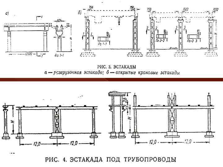 q Эстакады, предназначенные для прокладки трубопроводов с легковоспламеняющимися горючими жидкостями и газами, должны иметь несгораемые несущие и ограждающие конструкции. q Разгрузочные эстакады высотой от 1, 3 до 3 м. строят из сборных железобетонных плит, а высотой 6 м - из балочных конструкций. q. Открытые крановые эстакады предназначаются для обслуживания складов, оборудованных мостовыми электрическими кранами грузоподъемностью 10 -50 тонн и более. Их возводят из железобетонных и металлических конструкций.