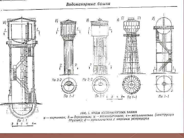 q Регулирующие емкости сооружаются в виде баков водонапорной башни или пневматической установки с водяными баками, содержащими объем воды для регулирования неравномерности водопотребления и противопожарных нужд. q Водонапорные башни могут быть отдельно стоящими и встроенными в производственное здание. Из экономических соображений целесообразно объединять баки хозяйственно-питьевой воды и умягченной сырой речной в общей водонапорной башне.