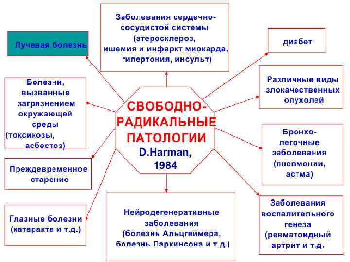 Биологическая стадия • Свободные радикалы, а также другие активные биохимические продукты стают катализаторами вторичных реакций, которые относятся к биологической стадии и развиваются лавинообразно, что может привести к серьезным нарушениям и гибели. Длительность биологической стадии от нескольких минут до десятков лет.
