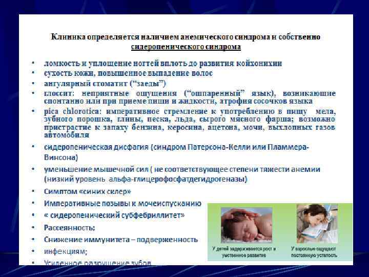 Клиническая картина Характерно наличие двух основных синдромов: Анемического (циркуляторно-гипоксического), который развивается при любой анемии и зависит от выраженности и скорости ее развития сидеропенического, обусловленного снижением уровня железа в сыворотке крови Железодефицитные анемии чаще всего развиваются у женщин детородного возраста, детей и подростков (прежде всего девушек). У женщин заболевание впервые манифестирует во время первых менструаций или первой беременности.