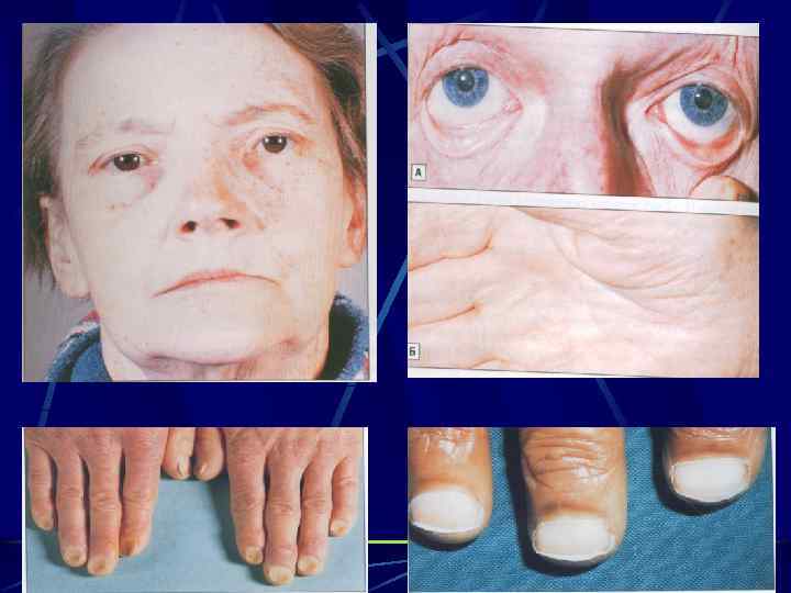 Клиническая картина Заболевание обычно манифестирует у людей в возрасте 50 -60 лет, распространено в Скандинавии. Медленно прогрессирует (от первых признаков болезни до диагноза проходит более года) Классическая клиническая картина включает 3 синдрома: 1) анемический (до степени развития анемической комы); 2) желудочно-кишечный (неприятные ощущения или боли в полости рта, чувство “ошпаренного” языка, снижение вкуса, нарушения стула); 3) неврологический (симметричные парестезии конечностей, −фуникулярный миелоз). В н. в. у большинства пациентов наблюдается только анемический синдром