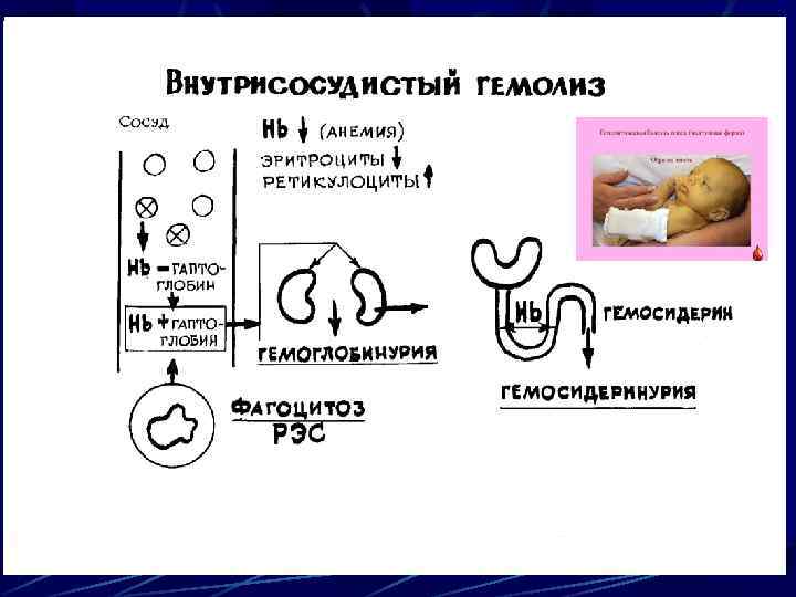 При внутрисосудистом гемолизе разрушение эритроцитов происходит во время их циркуляции в сосудистом русле Основные причины внутрисосудистого гемолиза: 1) переливание крови, несовместимой по системам АВО или Rh; 2) прием медикаментов при дефиците глюкозо-6 - фосфатдегидрогеназы 3) ряд аутоиммунных гемолитических анемий с холодовыми АТ, 4) пароксизмальная ночная гемоглобинурия; 5) заболевания, сопровождающиеся фрагментацией эритроцитов (протезы сосудов, клапанов сердца, микроангиопатии, маршевая гемоглобинурия)