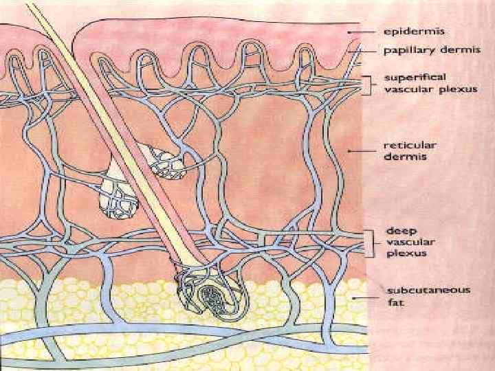 Кровеносная система • Кожные ветви артерий межмышечных фасциальных перегородок, а также мышечнокожные и надкостно-кожные артерии. • Глубокая сосудистая сеть – граница дермы и гиподермы. Питает потовые железы, поднимаясь волосяные фолликулы и сальные железы • Поверхностная сосудистая сеть – граница сосочковой и ретикулярной части дермы. Питает сосочки. • Венозная сеть состоит из четырех сетей: поверхностная (под сосочками), вторая (в середине дермы), третья (нижняя часть дермы), четвертая (подкожно-жировая клетчатка)