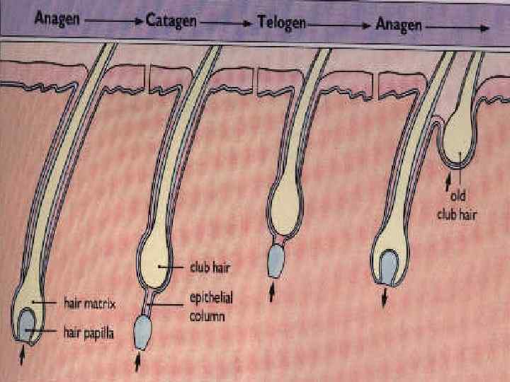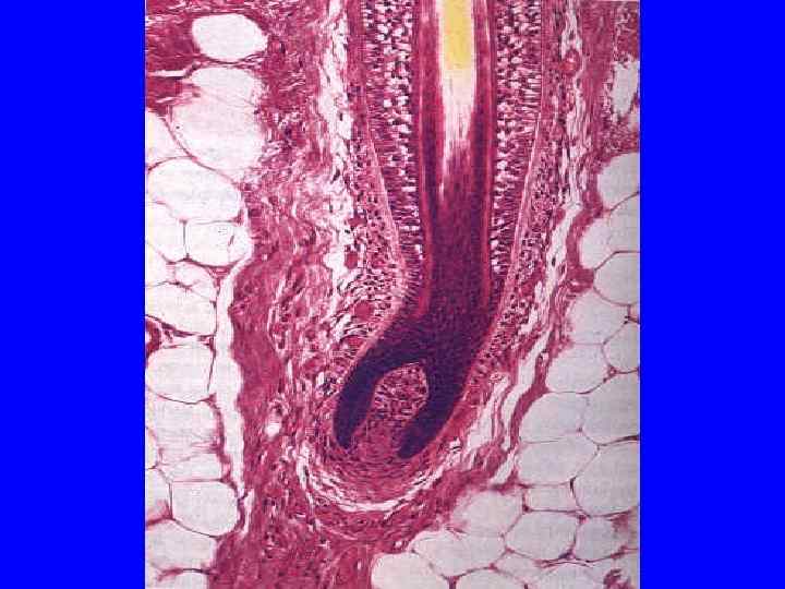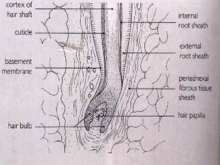 Волос (Pilis – лат. , Trichos – греч. ) • Стержень, корень, волосяная луковица, волосяной фолликул, воронка или устье волосяного фолликула, сосочек, мускул, выпрямляющий волос • Рост волос – брови – 0, 16 мм в сутки; борода – 0, 38; голова – 0, 35 мм.