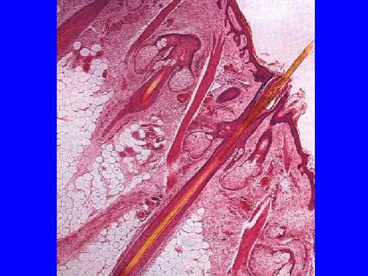 Волосы • • Покрывают все тело за исключением: - ладоней и подошв - ногтевых фаланг - боковых поверхностей пальцев - красной каймы губ - головки и внутреннего листка крайне плоти - малых половых губ и внутренних поверхностей больших половых губ