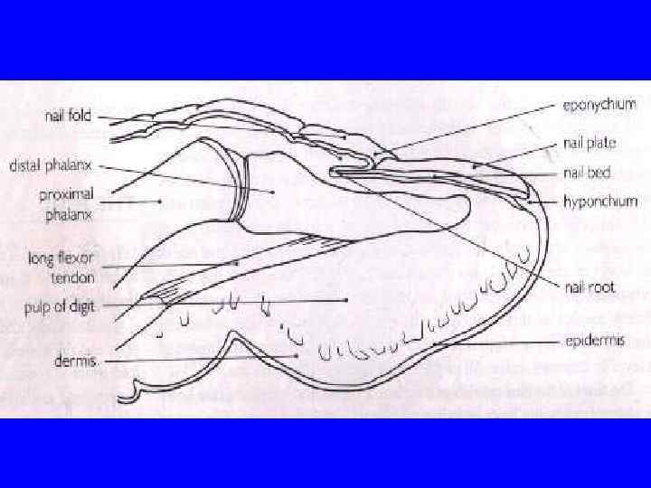 Строение ногтевой пластинки Skin of finger Proximal nail fold Cuticle Nail bed Free edge Lunula (half moon) Distal nail plate Matrix cells Nail growth Supporting tissue Bone Skin of digital pulp
