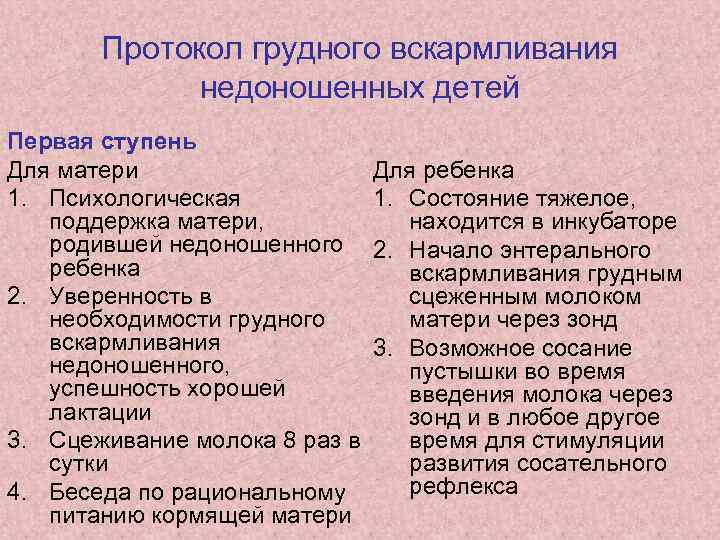 Вторая ступень Для матери Для ребенка 1. «Непитательное» 1. Состояние стабильное. пребывание ребенка у Продолжается груди матери вскармливание через зонд 2. Продолжается 2. Возможно пребывание вне сцеживание молока 8 раз инкубатора на руках у в сутки матери в течение 5 10 мин 3. Разъяснить цели для «непитательного» прикладывания к груди пребывания у груди: а) 3. У ребенка имеется стимуляция лактации б) глотательный рефлекс психологический аспект в) 4. На любой ступени способствует выработки возможно использование антител направленного добавок (обогатителей) ответа в иммунной грудного молока энтеросистеме молочной железы 4. Обучение навыкам грудного вскармливания