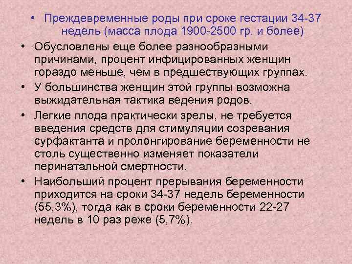 • Преждевременные роды при сроке гестации 34 37 недель (масса плода 1900 2500 гр. и более) • Обусловлены еще более разнообразными причинами, процент инфицированных женщин гораздо меньше, чем в предшествующих группах. • У большинства женщин этой группы возможна выжидательная тактика ведения родов. • Легкие плода практически зрелы, не требуется введения средств для стимуляции созревания сурфактанта и пролонгирование беременности не столь существенно изменяет показатели перинатальной смертности. • Наибольший процент прерывания беременности приходится на сроки 34 37 недель беременности (55, 3%), тогда как в сроки беременности 22 27 недель в 10 раз реже (5, 7%).