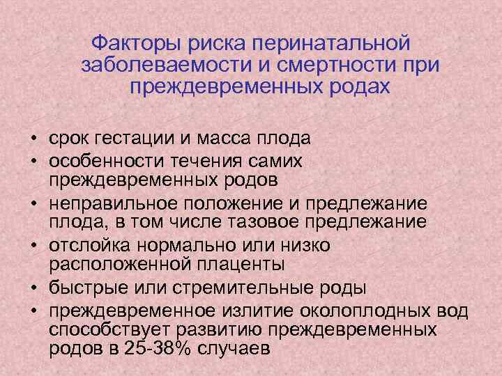 Факторы риска перинатальной заболеваемости и смертности при преждевременных родах • срок гестации и масса плода • особенности течения самих преждевременных родов • неправильное положение и предлежание плода, в том числе тазовое предлежание • отслойка нормально или низко расположенной плаценты • быстрые или стремительные роды • преждевременное излитие околоплодных вод способствует развитию преждевременных родов в 25 38% случаев