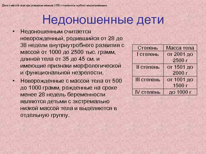 Дети с массой тела при рождении меньше 1500 г считаются глубоко недоношенными. Недоношенные дети • Недоношенным считается новорожденный, родившийся от 28 до 38 недели внутриутробного развития с Степень Масса тела массой от 1000 до 2500 тыс. грамм, I степень от 2001 до длиной тела от 35 до 45 см. и 2500 г имеющие признаки морфологической II степень от 1501 до и функциональной незрелости. 2000 г • Новорожденные с массой тела от 500 III степень от 1001 до 1000 грамм, рожденные на сроке 1500 г IV степень до 1000 г менее 28 недель беременности являются детьми с экстремально низкой массой тела и выделяются в отдельную группу.