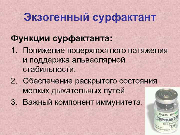 Экзогенный сурфактант Функции сурфактанта: 1. Понижение поверхностного натяжения и поддержка альвеолярной стабильности. 2. Обеспечение раскрытого состояния мелких дыхательных путей 3. Важный компонент иммунитета.