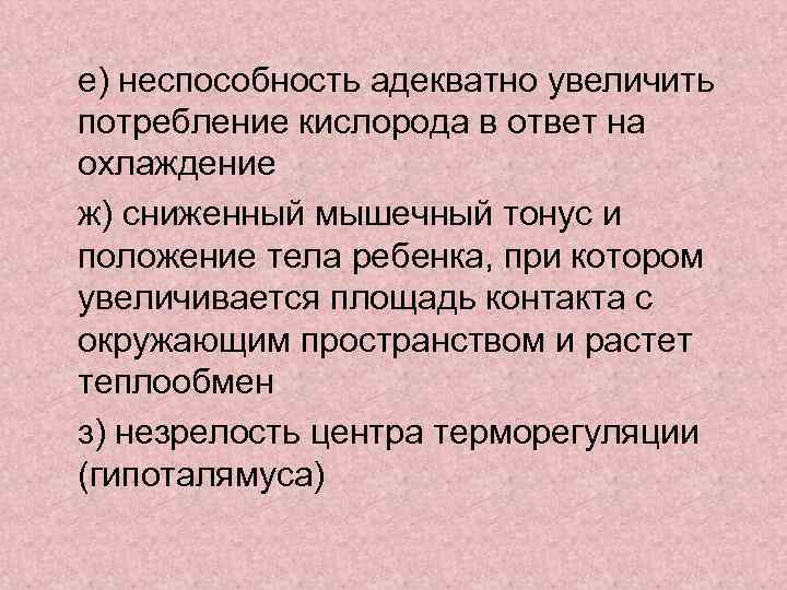 е) неспособность адекватно увеличить потребление кислорода в ответ на охлаждение ж) сниженный мышечный тонус и положение тела ребенка, при котором увеличивается площадь контакта с окружающим пространством и растет теплообмен з) незрелость центра терморегуляции (гипоталямуса)