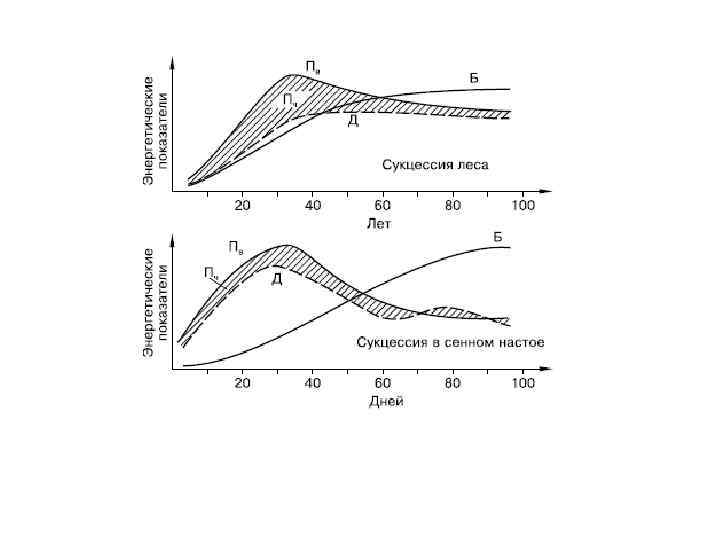 При всех типах сукцессий происходят следующие изменения в биогеоценозах: Энергетика биогеоценоза: Возрастание биомассы и количества органического детрита; Возрастание валовой первичной продукции, Уменьшение чистой первичной продукции. Вторичная продукция изменяется слабо; Состояние между энергией прироста и энергией, затраченной на дыхание, на начальных этапах больше единицы, на конечных – приближается к ней. Соотношение между продукцией и биомассой уменьшается. Соотношение Шредингера снижается.