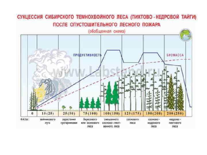 Первичная автогенная сукцессия на примере формирования темнохвойного леса в Сибири после опустошительного пожара. Фаза Пожар Вейниковый луг Зарастание кустарником Березовый или осиновый лес Смешанный лес сосново – лиственного типа Сосновые леса Сосново – кедровые леса Кедрово – пихтовые леса Возраст, годы Примечания 0 Полное отсутствие почвенного и растительного покрова Вначале преобладают однолетние сорняки, а затем многолетние травы 15 – 25 25 – 50 75 – 100 – 150 125 – 175 150 – 200 – 250