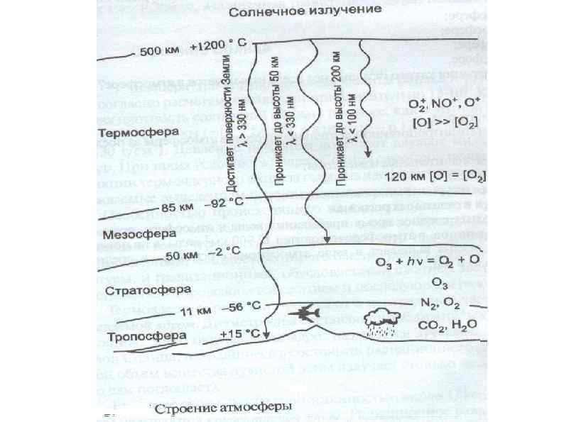Характеристика основных зон, выделяемых в атмосфере Температура, 0 С Зона атмосферы Температур Верхняя и ный нижняя граница зоны верхняя граница зоны Тропосфера 15 56 6, 45 0 11 Стратосфер а 56 2 +1, 38 11 50 Мезосфера 2 92 2, 56 50 85 1200 +3, 11 85 500 Термосфера 92 градиент, 0 С/км от уровня моря, км