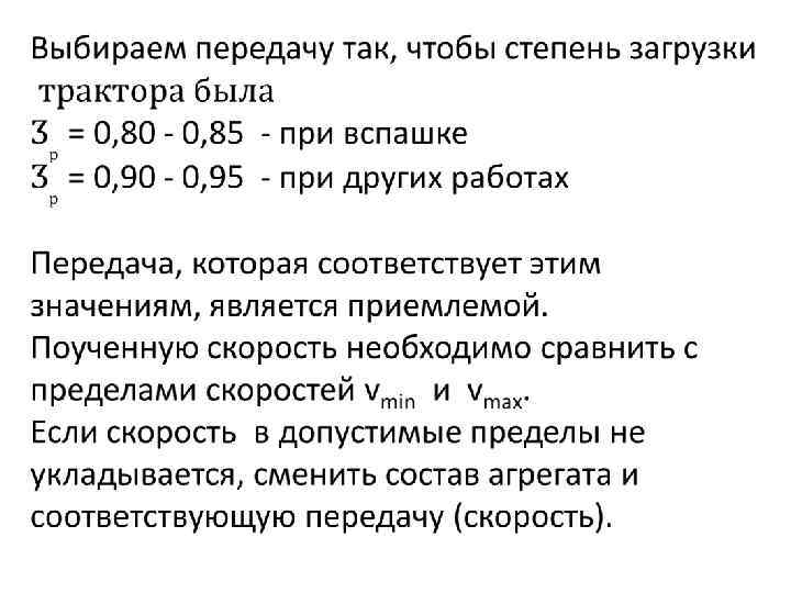 Касательная сила тяги трактора – сила, развиваемая на ободе колеса при взаимодействии его с почвой Рк. н = (0, 159 Nен·I ·ηт)/(rк·nн), к. Н; где I – передаточное число трансмиссии; I = nн/nк; nк – частота вращения колеса; ηт – к. п. д. трансмиссии; Fс – сила сцепления аппарата с почвой. Fс = Gс·μ, к. Н; где Gс – сцепной вес трактора, к. Н. Gс = G - для гусеничных и колесных тракторов с двумя ведущими осями. Gс = 2/3·G - для колесных тракторов с одной ведущей осью. Степень использования силы тяги трактора Ʒр = Rа /Ркр. н