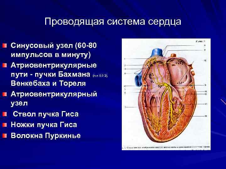 Проводящая система сердца Синусовый узел (60 -80 импульсов в минуту) Атриовентрикулярные пути - пучки Бахмана (л. п 0, 0 2), Венкебаха и Тореля Атриовентрикулярный узел Ствол пучка Гиса Ножки пучка Гиса Волокна Пуркинье