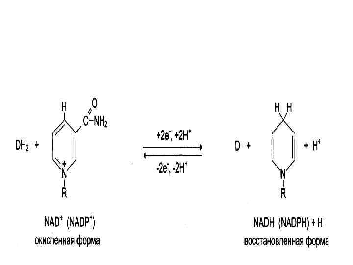 Никотинамидные коферменты • • Производные витамина РР (никотинамид); НАД (никотинамидадениндинуклеотид); НАДФ (никотинамидадениндинуклеотидфосфат); Коферменты могут быть в окисленной и восстановленной формах; • НАД и НАДФ связаны с ферментами дегидрогеназами, которые в окислительновосстановительных реакциях.