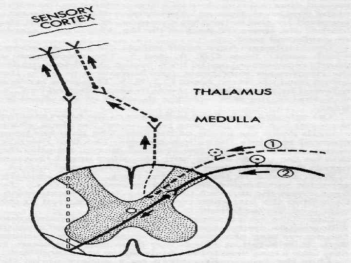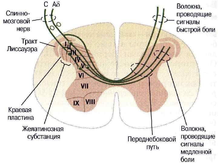 ПУТИ ПРОТОПАТИЧЕСКОЙ ЧУВСТВИТЕЛЬНОСТИ 1. Свободные нервные окончания 2. Волокна С (0. 5 -2 м/с) 3. II и III пластины заднего рога (subs. gelatinosa) 4. Интернейрон(ы) 5. V пластина → на др. сторону