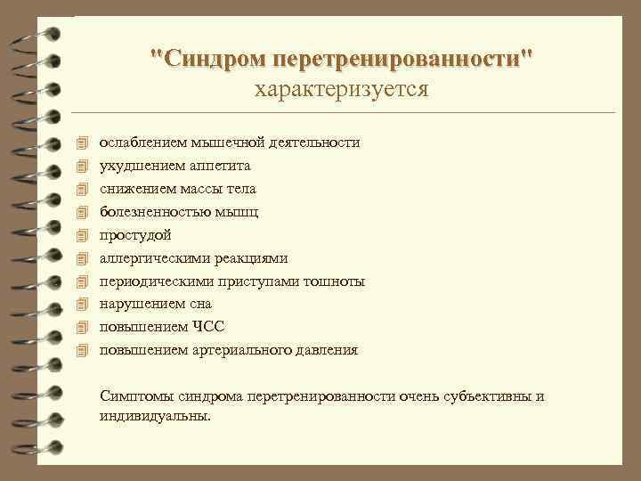 "Синдром перетренированности" характеризуется 4 ослаблением мышечной деятельности 4 ухудшением аппетита 4 снижением массы тела 4 болезненностью мышц 4 простудой 4 аллергическими реакциями 4 периодическими приступами тошноты 4 нарушением сна 4 повышением ЧСС 4 повышением артериального давления Симптомы синдрома перетренированности очень субъективны и индивидуальны.