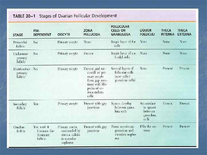Секреторный потенциал гранулезных клеток: андростендион, синтезируемый клетками внутренней теки, попадает в цитоплазму гранулезнных клеток, где он превращается с помощью ароматазы в женский половой гормон – эстрадиол; Продолжающаяся пролиферация гранулезных клеток зависит от ФСГ, который обеспечивает секрецию не только эстрогенов, но и: прогестерона, ингибина, фолликулостатина, активина, которые регулируют выработку ЛГ и ФСГ по механизму отрицательной обратной связи.