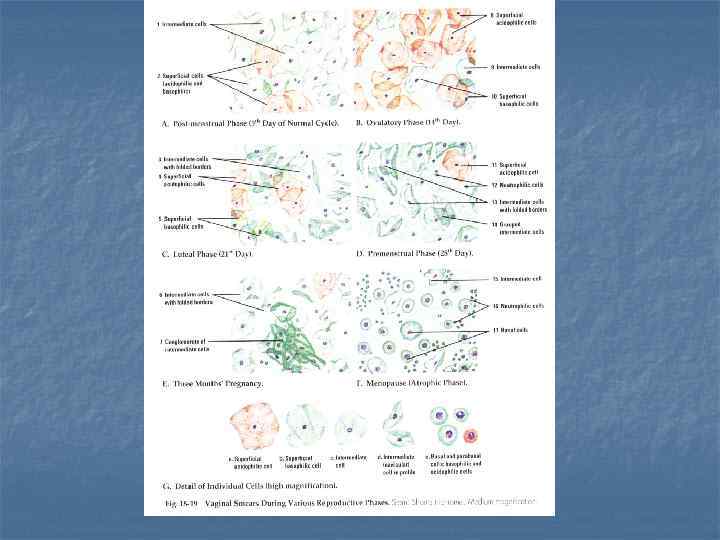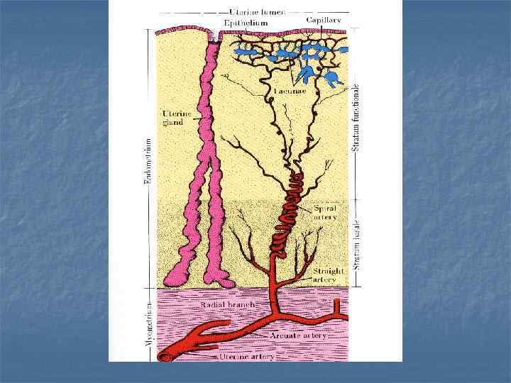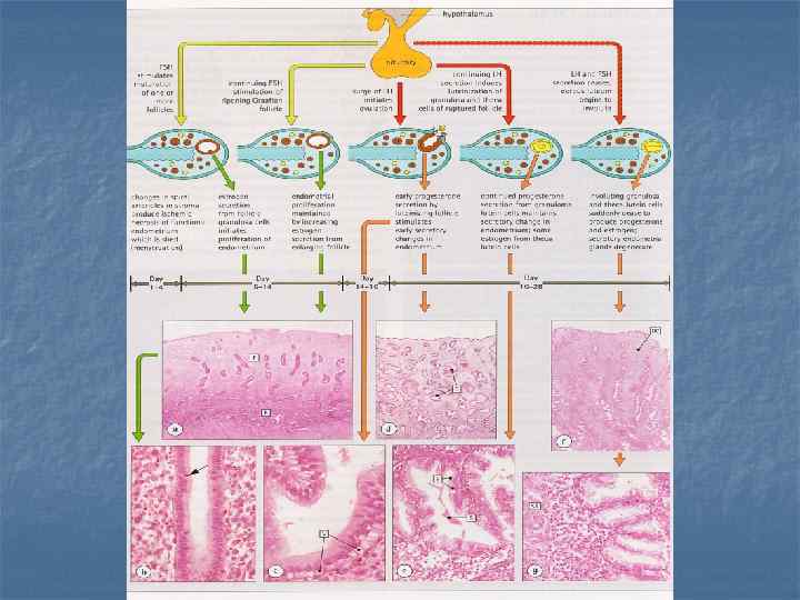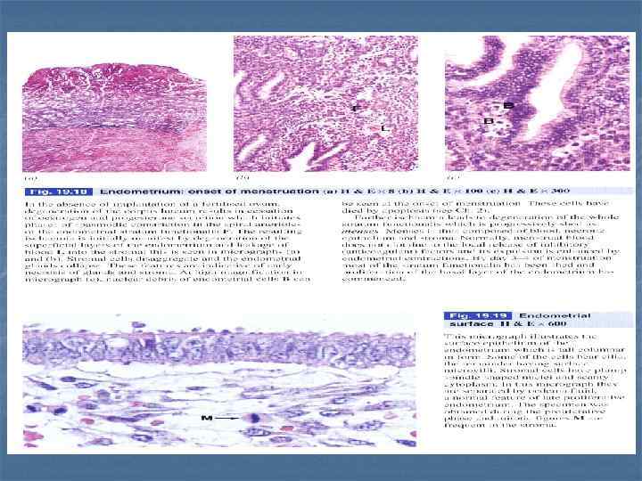 Менструальный цикл Menstrual phase (Days 1 -4) is characte-rized by the desquamation of the functionalis layer of endometrium. Follicular phase (Days 4 -14) is characterized by a re-epithelization of the endometrial lining and renewal of the functionalis. Luteal phase (Days 15 -28) is characterized by thickening of the endometrium as a result of edema and accumulated glycogen secretions of the highly coiled endometrial glands.