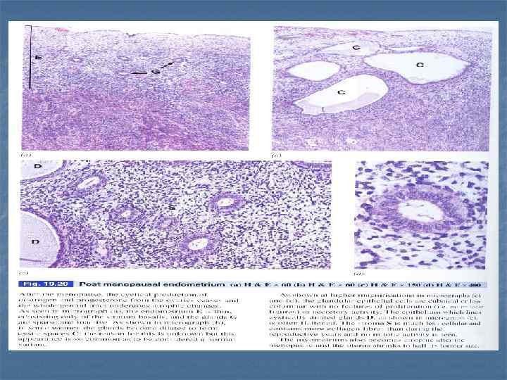 Секреторная фаза (C) длится с 15 по 27 день. Endometrium Myometrium Матка, эндометрий B. Пролиферативная фаза, C. Секреторнаяфаза H & E, x 50. Coiled gland s Sacculated glands Это лютеиновая фаза – железы перестают пролиферировать, начинают растягиваться и обильно секретировать. В средней части слизистой видны мешотчатые расширения желез. Эта стадия инициирована прогестероном.
