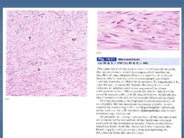 Эндометрий матки A. Ранняя постменструальная фаза B. Пролиферативная фаза, H & E, x 50. Endometrium Myometrium В раннюю постменструальную фазу (А) – 5 -6 -ой дни, остатки желез в базальной зоне пролиферируют и мигрируют на поверхность, чтобы закрыть дефект слизистой, вызванный кровотечением. Толстый миометрий собран в 3 слоя.