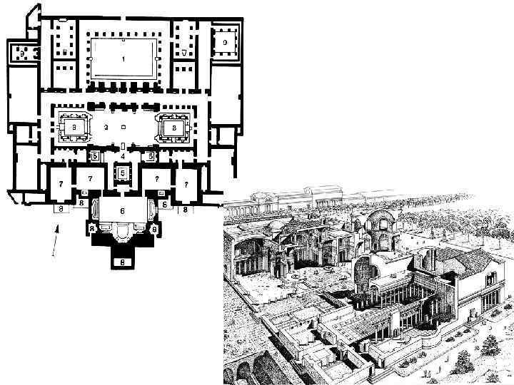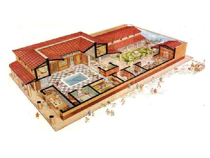 Римский дом по Витрувию: 1. Вестибул 2. Коридор 3. Имплювий 4. Атрий 5. Крылья 6. Таблинум 7. Проход (andron) 8. Перистиль 9. Экседра