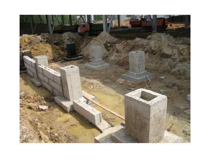 Ленточные фундаментыа Конструкция прерывистого сборного фундамента из железобетонных плит Конструкция ленточного фундамента из фундаментных стеновых блоков и подушек не сплошным рядом (прерывистые фундаменты)