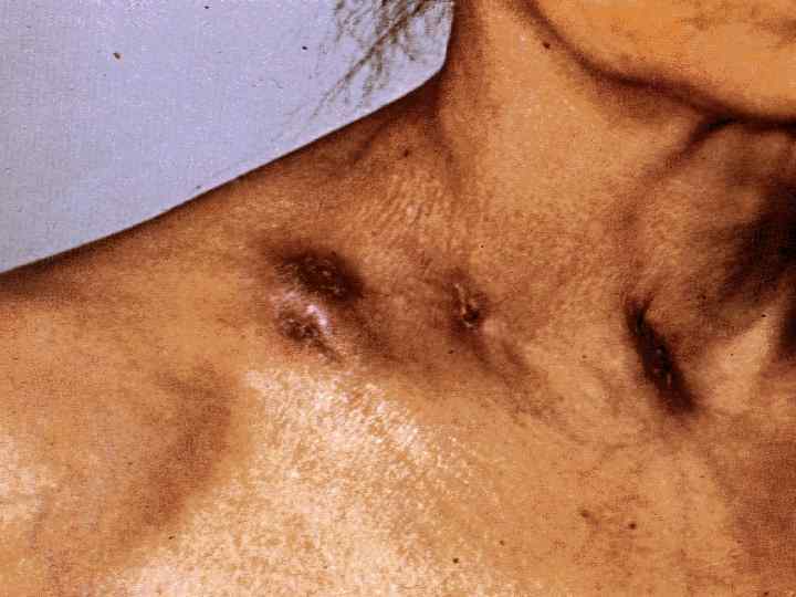 Скрофулодерма или колликвативный туберкулез n Встречается преимущественно у детей и в юношеском возрасте. Заболевание возникает в основном вторично, путем распространения процесса на кожу по протяжению из пораженных туберкулезом лимфатических узлов, реже костей и суставов. Первичная скрофулодерма развивается гематогенным или лимфогенным путем переноса МБТ в кожу из туберкулезных очагов в легких или других органов.