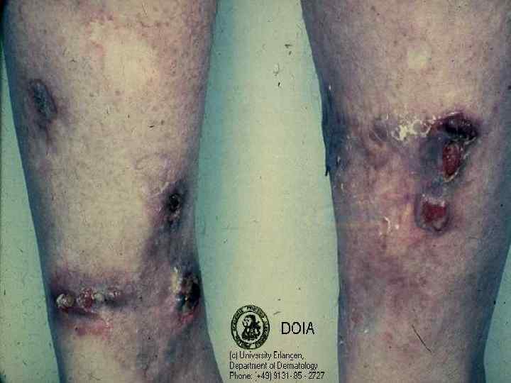 Папуло-некротический туберкулез n n n МБТ распространяются лимфо- и гематогенным путем из легких, лимфоузлов, пораженных туберкулезом. развивается в детском и юношеском возрасте, чаще у женщин процесс локализуется на коже разгибательных поверхностей конечностей, ягодиц, реже на лице первичными элементами являются рассеяные бугорки и узелки, величиной с горошину, буровато-синюшного оттенка в центральной части бугорков в результате казеозного распада формируется плотно-сидящая сероватокоричневатого цвета корка. При ее снятии обнажается язвочка, оставляющая после заживления штампованные рубчики протекает заболевание приступообразно с обострениями зимой и ремиссиями летом. Общее состояние больных не страдает
