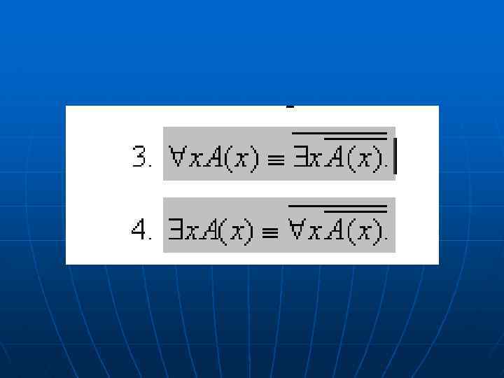 Равносильные формулы логики предикатов n n Определение Две формулы логики предикатов А и В называются равносильными на области М, если они принимают одинаковые логические значения при всех значениях входящих в них переменных, отнесенных к области М.