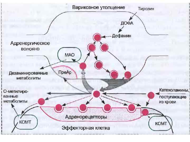Адренергические синапсы образованы окончаниями постганглионарных симп-х (адренергических) волокон и клетками эффекторных органов. Синтез НА из тирозина→ в варикозные утолщения, под влиянием тирозингидроксилазы превращается в ДОФА (диоксифенилаланин). Из ДОФА при участии ДОФА-декарбоксилазы →дофамин. Путем акт. транспорта дофамин → ч/з мембрану везикул, где превращ-ся в НА. При →импульса происходит деполяризация пресинаптической мембраны, открываются потенциал-зависимые Са 2+-каналы, ионы Са 2+ поступают в цитоплазму варикозного утолщения, способствуют экзоцитозу везикул, высвобождению НА в синаптическую щель и его взаимодействие с АР постсинаптической мембраны. Д-е НА кратковременно, ≥ часть (80%) подвергается нейрональному захвату. В варикоз. утолщении часть НА дезаминируется под влиянием моноаминоксидазы (МАО), основное кол-во НА захватывается везикулами (везикулярный захват). Небольшое кол-во НА захват-ся эффекторными клетками, где он инакт -ся катехол-О-метилтрансферазой (КОМТ). С помощью ЛС влияют на разные этапы норадренергической передачи.