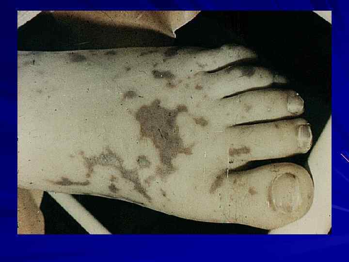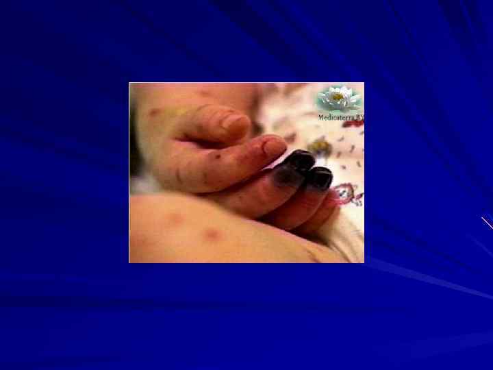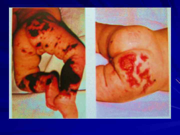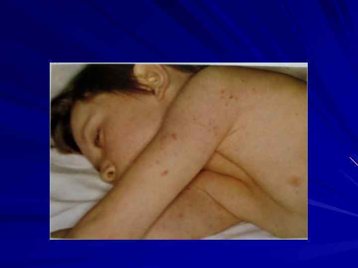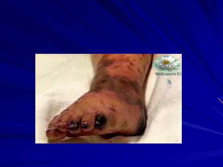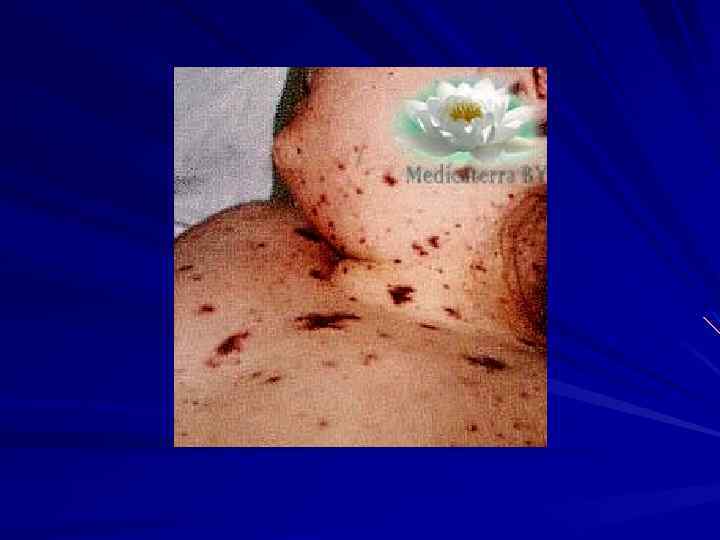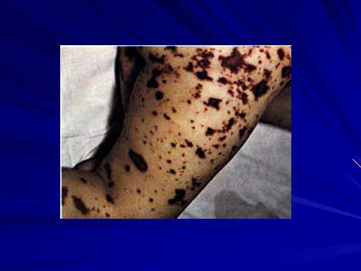 КЛИНИКА Менингококкцемия острое начало озноб, t 39 -41 С выраженная интоксикация Характер сыпи: геморрагическая сыпь неправильной формы Локализация: на коже нижних конечностей и ягодицах Сроки появления: через 5 -15 часов от начала болезни