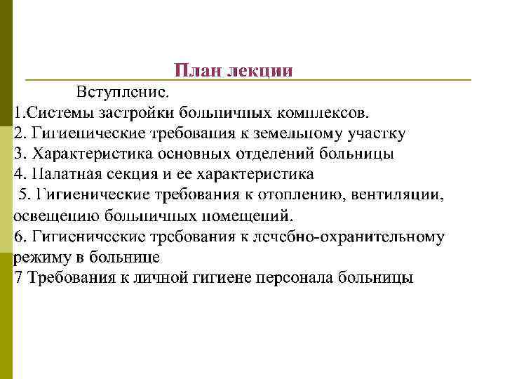 Процесс создания оптимальных гигиенических условий в лечебнопрофилактических учреждениях в значительной степени также определяется особенностями планирования и застройки земельного участка, упорядочением и внутренней планировкой зданий, их благоустройством, санитарно гигиеническим