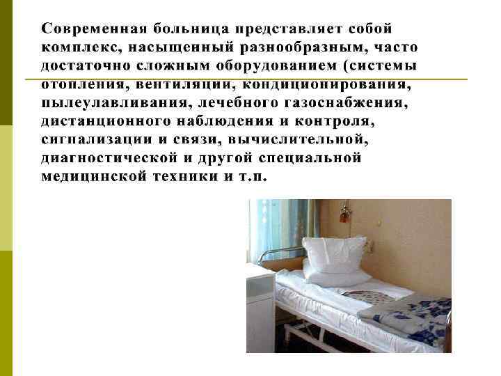 Для успешного лечения и быстрого выздоровления больных необходимы: -благоприятное освещение, -оптимальная температура, -достаточное пространство, -хорошо инсолированная и вентилируемая палата, -удобная кровать, -спокойные условия окружения, -здоровый отдых, -рациональное и диетическое питание, - хорошее санитарно-гигиеническое обслуживание, -достаточное озеленение территории для прогулок на свежем воздухе, -полный соматический и психологический комфорт.