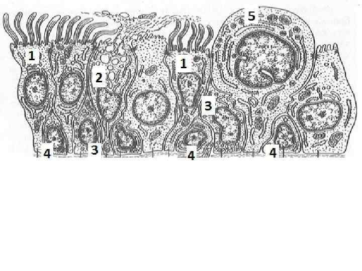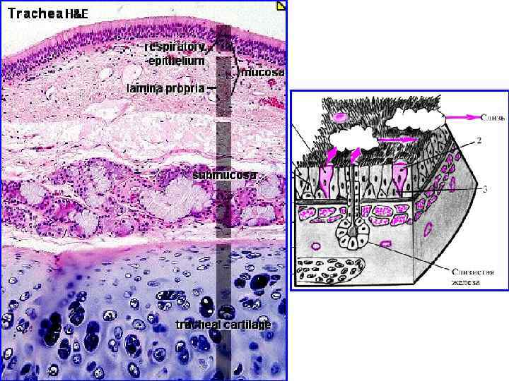 Эпителий трахеи содержит реснитчатые, бокаловидные, вставочные и эндокринные клетки. Реснитчатые клетки имеют реснички, колеблющиеся против движения вдыхаемого воздуха. Они удаляют микроорганизмы и инородные частицы. Бокаловидные клетки секретируют муцины - слизь, которая склеивает инородные тела, бактерии и облегчает их выделение. Микроворсинчатые клетки являются хеморецепторными. Базальные или вставочные клетки играют роль камбия.