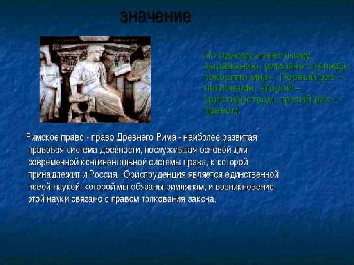 • Ри мское пра во — правовая система, существовавшая в Древнем Риме и в Византийской империи с VIII века до н. э. по VI век н. э. , а также отрасль правовой науки, занимающаяся её изучением. • Римское право явилось образцом или прообразом правовых систем многих других государств, является исторической основой романогерманской (континентальной) правовой семьи.