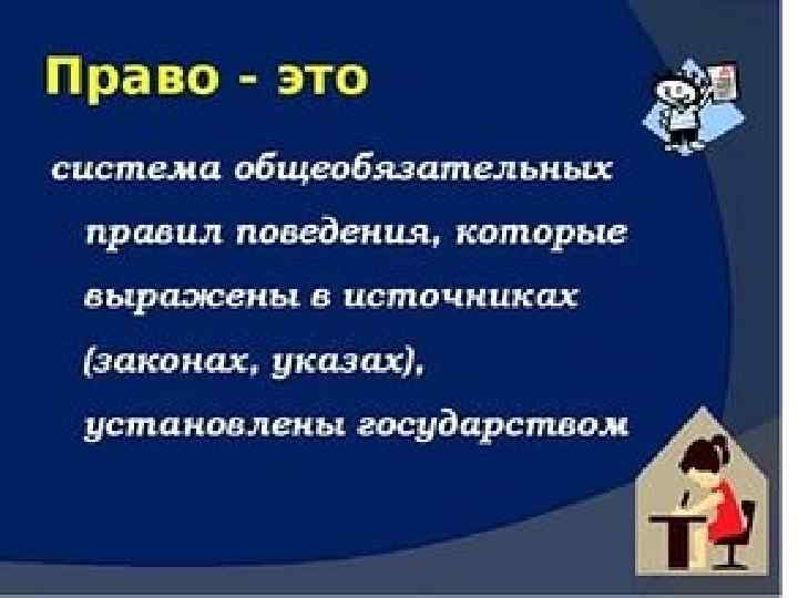 • Признаки права • Различные учёные выделяют следующие наиболее распространенные признаки права[ • Нормативность (устанавливает правила поведения общего характера); • Общеобязательность (действие распространяется на всех, либо на большой круг субъектов); • Гарантированность государством (подкреплено мерами государственного принуждения); • Интеллектуально-волевой характер (право выражает волю и сознание людей); • Формальная определённость (нормы права выражены в официальной форме); • Системность (право — это внутренне согласованный, упорядоченный организм).