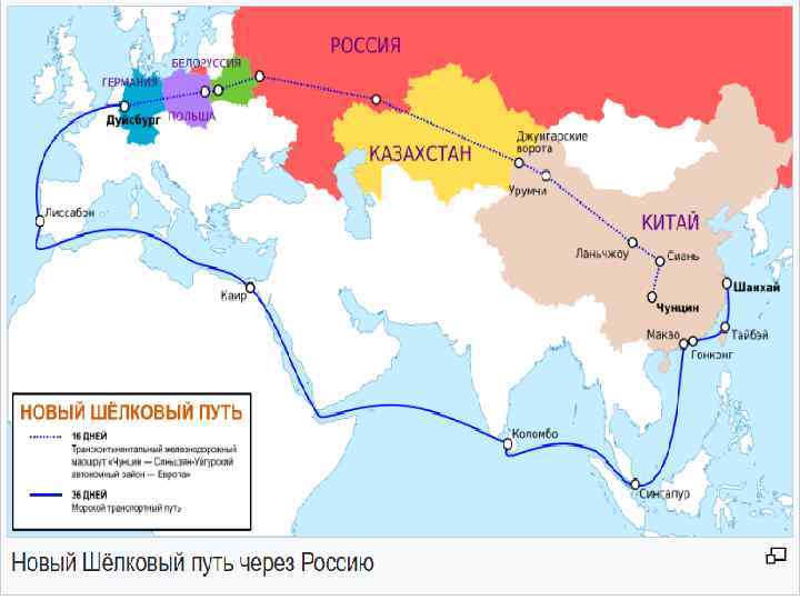 Новый шёлковый путь (Евразийский сухопутный мост) — • транспортный маршрут для перемещения грузов и пассажиров по суше из Китая в страны Европы. Маршрут включает трансконтинентальную железную дорогу — Транссибирскую магистраль, которая проходит через Россию и второй Евразийский континентальный мост, проходящий через Казахстан.
