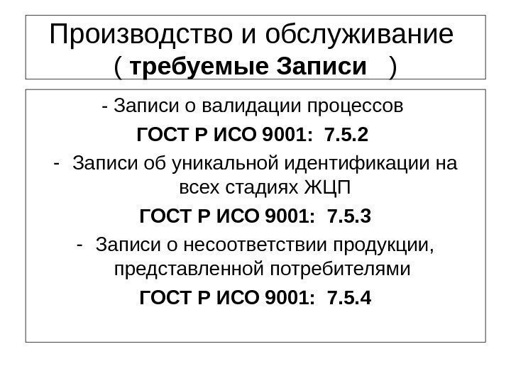 Производство и обслуживание ( требуемые. Записи ) — Записи о валидации процессов ГОСТРИСО 9001: 7. 5. 2 — Записи об уникальной идентификации на всех стадиях ЖЦП ГОСТРИСО 9001: 7. 5. 3 — Записи о несоответствии продукции, представленной потребителями ГОСТРИСО 9001: 7. 5.