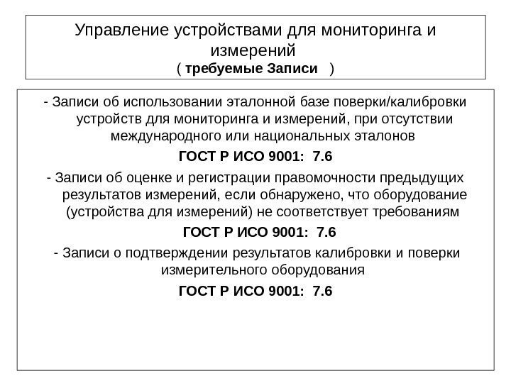 Управление устройствами для мониторинга и измерений ( требуемые. Записи ) — Записи об использовании эталонной базе поверки/калибровки устройств для мониторинга и измерений, при отсутствии международного или национальных эталонов ГОСТРИСО 9001: 7. 6 — Записи об оценке и регистрации правомочности предыдущих результатов измерений, если обнаружено, что оборудование (устройства для измерений) не соответствует требованиям ГОСТРИСО 9001: 7. 6 — Записи о подтверждении результатов калибровки и поверки измерительного оборудования ГОСТРИСО 9001: 7.
