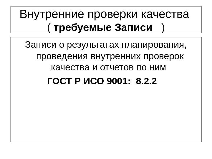Внутренние проверки качества ( требуемые. Записи ) Записи о результатах планирования, проведения внутренних проверок качества и отчетов по ним ГОСТРИСО 9001: 8. 2.