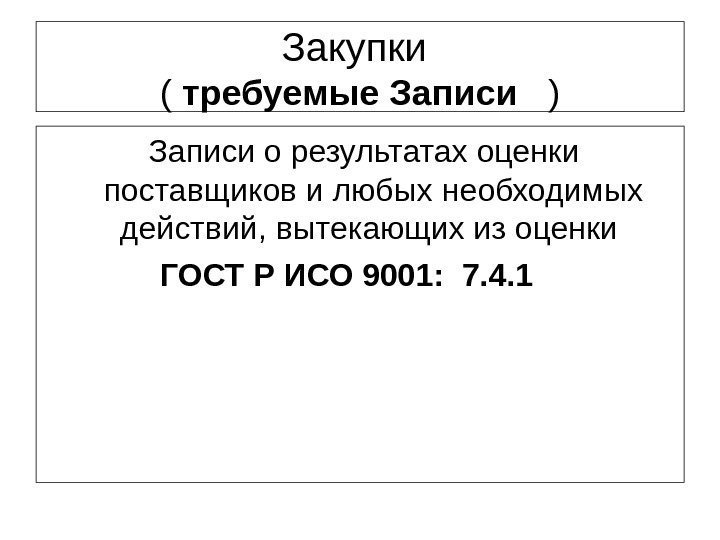 Закупки ( требуемые. Записи ) Записи о результатах оценки поставщиков и любых необходимых действий, вытекающих из оценки ГОСТРИСО 9001: 7. 4.